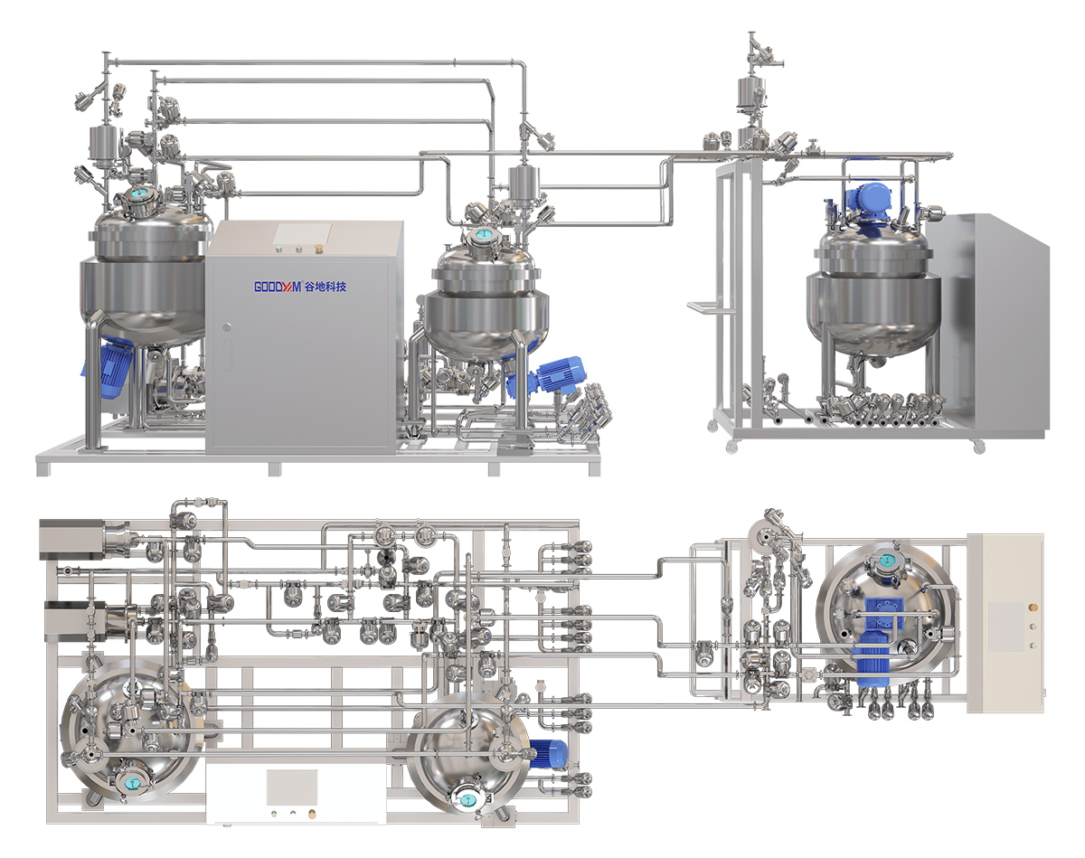 配制1:加热、搅拌、均质 ⼆次或多次进料 配制2:加热、搅拌、均质 取样:合格 出料:管阀、泵、过滤⾄灌装 |