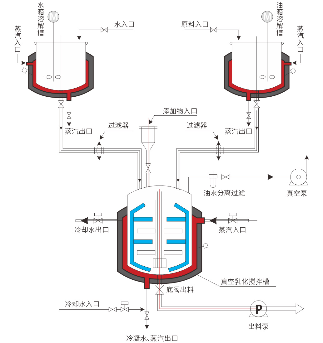 将⽔相和油相物料分别投⼊油相罐和⽔相罐进⾏分散、溶解,然后分别由真空吸⼊乳化罐进⾏搅拌、乳化、剪切。制作过程中三个罐体按要求分别进⾏加热、冷却,乳化罐⾃带真空系统。