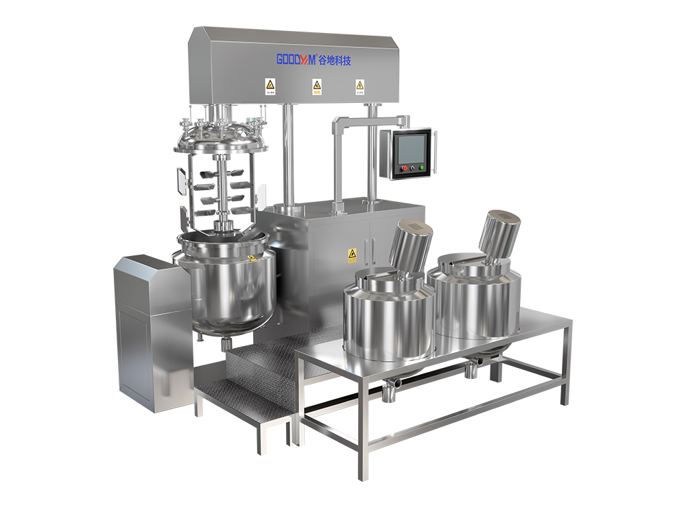 全套真空乳化机由:油、⽔相罐、工作台、主机等组成。